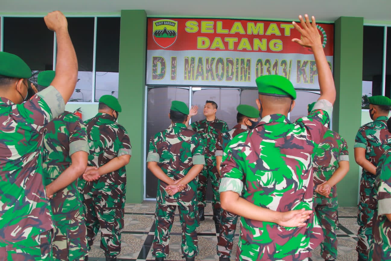BANGKINANG - Bertempat di serambi Kehormatan Kodim 0313/KPR, Komandan Kodim 0313/KPR, Letkol Inf Leo Octavianus. M. Sinaga. S. Sos. MI. Pol, menerima Anggota Baru dari satuan tempur maupun satuan teritorial memasuki Satuan Baru Kodim 0313/KPR, Senin (10/01/2022)