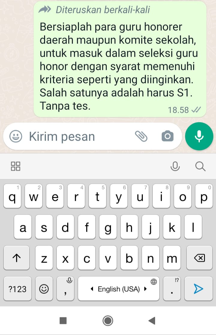SELATPANJANG - Kembali beredar kabar tidak benar tentang seleksi Tenaga Non PNS khusus guru di grup whatsapp di kalangan masyarakat Kepulauan Meranti.