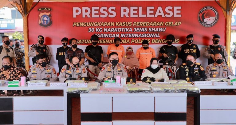 Konferensi Pers Kapolda Riau pengungkapan kasus tindak pidana narkoba dengan barang bukti 30 kg sabu.