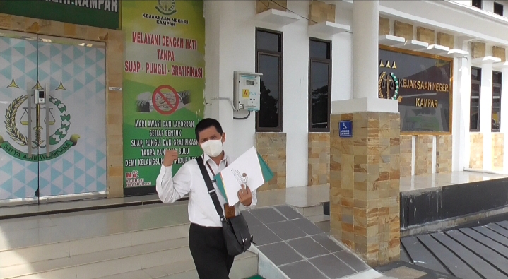 Setelah beberapa jam dimintai keterangan terlihat Kakan BPN Kampar Dedy keluar dari gedung Adhyaksa Kampar dengan mengenakan baju kemeja  putih lengan panjang dan celana hitam.