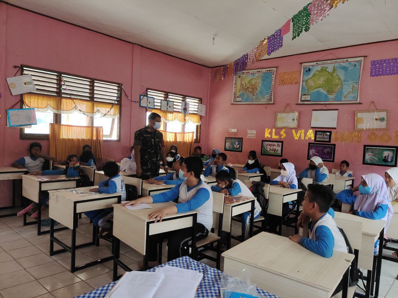TAPUNG HILIR - Sertu Dedi Isriadi Babinsa koramil 16/Tapung Kodim 0313/Kampar memberikan materi wawasan kebangsaan (wasbang) kepada siswa-siswi SD Negri 003 Desa Kota Garo Kecamatan Tapung Hilir Kabupaten Kampar. Senin (07/03/2022).