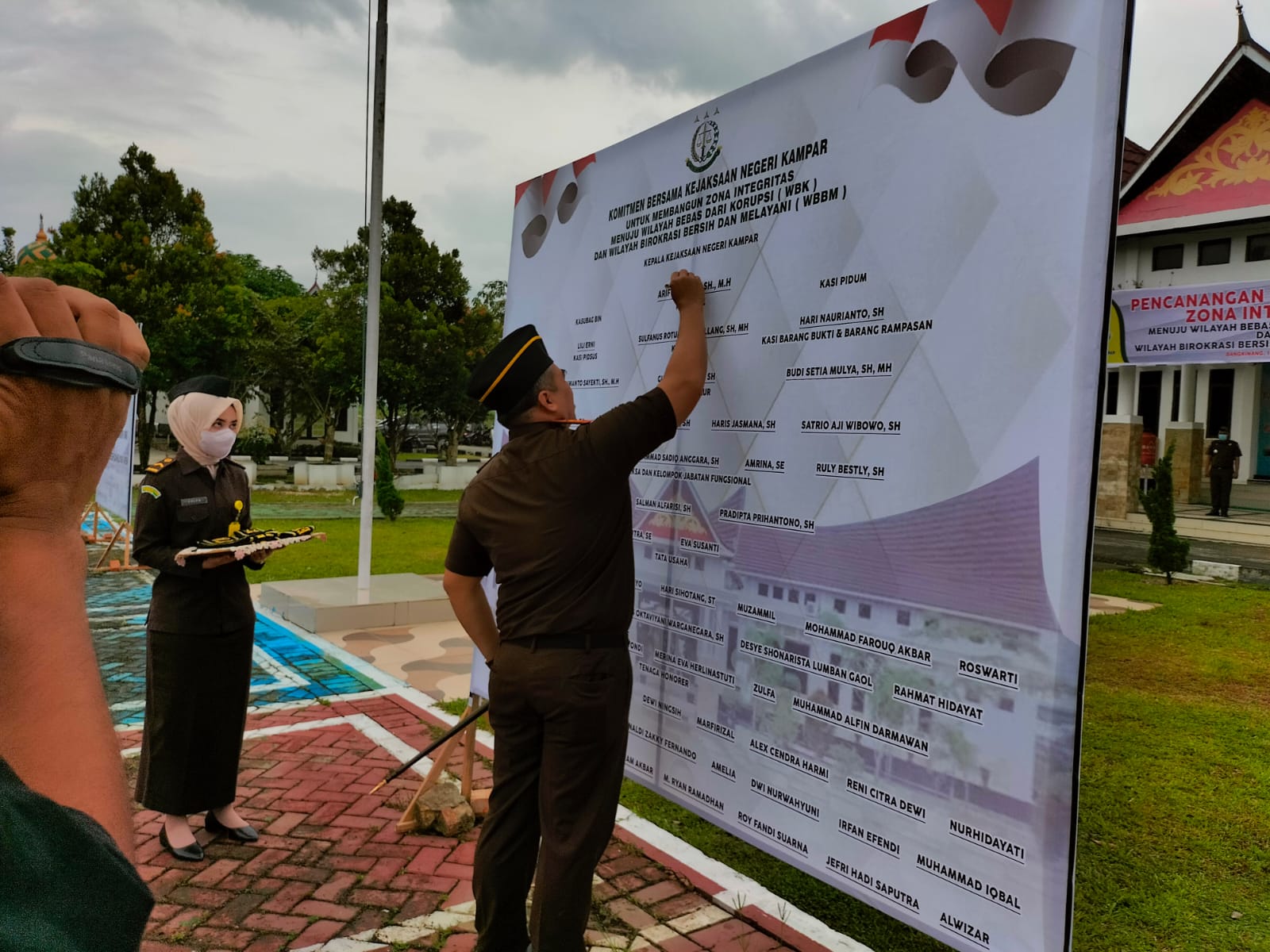 BANGKINANG - Menindaklanjuti instruksi Jajsa Agung (JA) Republik Indonesia, Kejaksaan Negeri (Kejari) Kampar menggelar apel penandatanganan  Pencanangan Pembangunan Zona Integritas menuju wilayah bebas dari korupsi (WBK) dan Wilayah Birokrasi Bersih dan Melayani (WBBM), Senin (14/3/2022).
