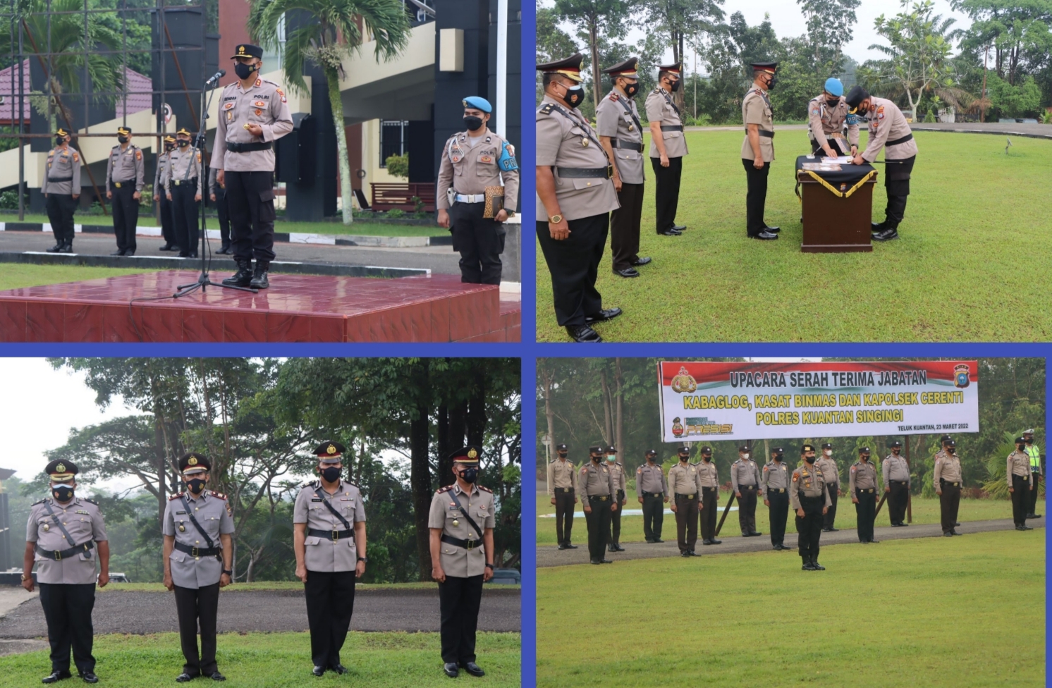 TELUK KUANTAN - Kapolres Kuansing AKBP Rendra Oktha Dinata, SIK M.Si Pimpin upacara serah terima Jabatan Kasat Binmas, Kabag Log, dan Kapolsek Cerenti Rabu (23/3/2022) di lapangan Upacara Mapolres Kuansing sekira pukul 07.30 wib.