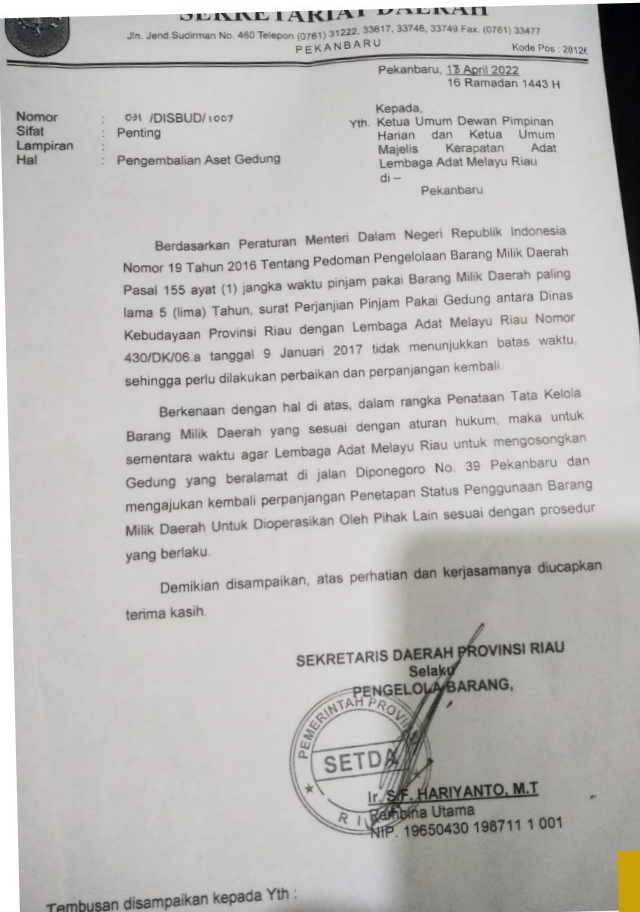 "Untuk sementara waktu agar Lembaga Adat Melayu Riau mengosongkan gedung di Jalan Diponegoro nomor 39 Pekanbaru dan mengajukan kembali perpanjangan," demikian kutipan surat tersebut.