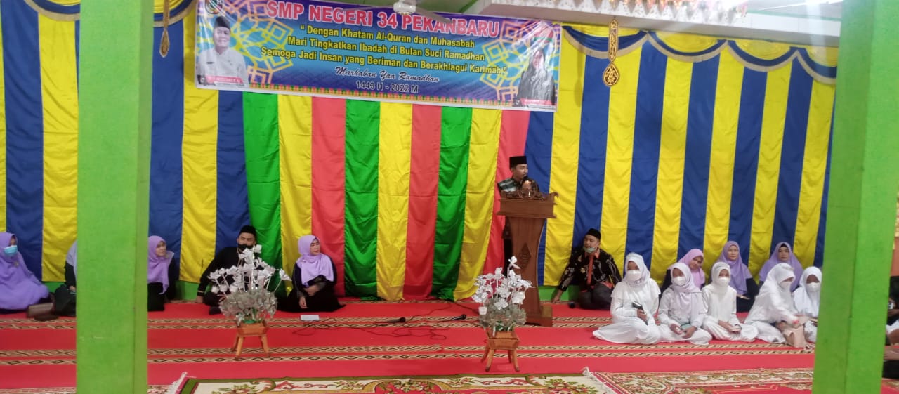 Sri Tuti Wahyuni Selaku Kepala SMP N 34 Pekanbaru mengatakan dalam kegiatan ini bertepatan dengan Nuzul Qur’an serta diadakan Juga Khatam Al-Qur’an, pesanteren kilat ramadhan, serta juga melakukan kegiatan zakat fitrah dari anak anak, dengan tujuan bagaimana anak-anak belajar cara membayar zakat serta Kita juga ada santunan anak-anak yatim yang mana ini kami kumpul dari sedekah dan infak selama ramadhan ini.