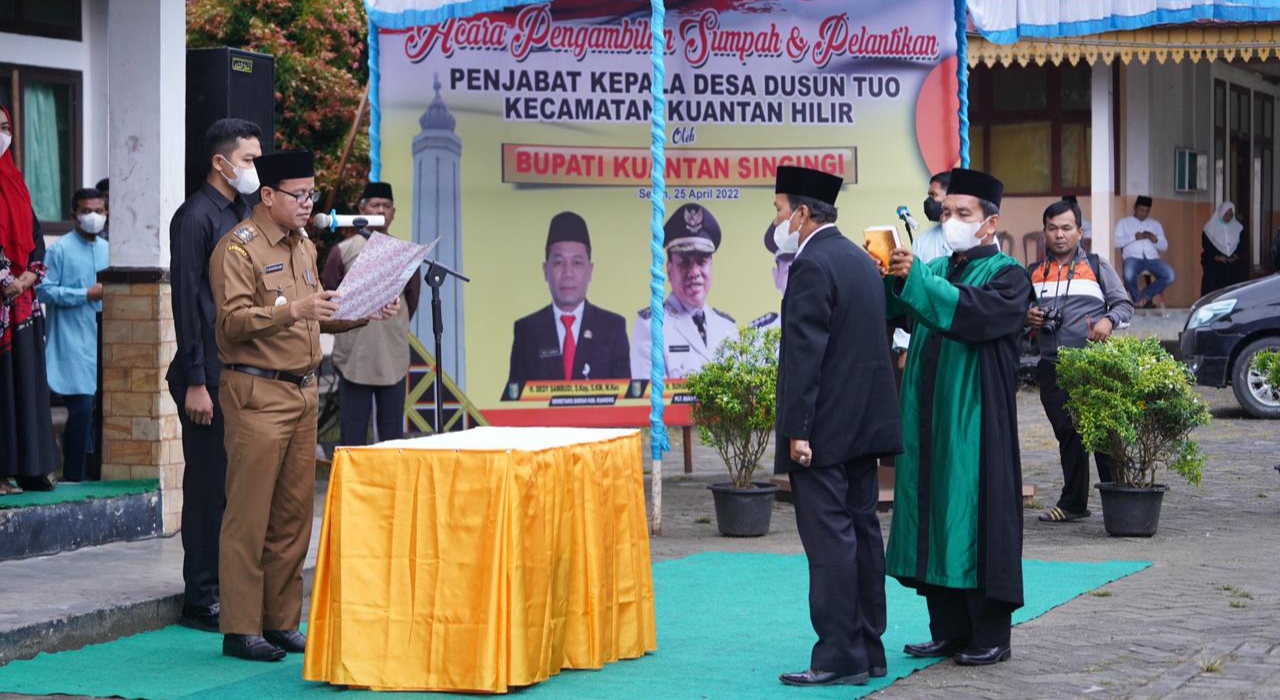 TELUK KUANTAN - Plt Bupati Kuantan Singingi Drs H Suhardiman Amby Ak MM kembali melantik Penjabat (Pj) Kepala Desa (Kades), kali ini Pj Kades Dusun Tuo Kecamatan Kuantan Hilir, pada Senin (25/04/2022) sore di Halaman Kantor Camat Kuantan Hilir.