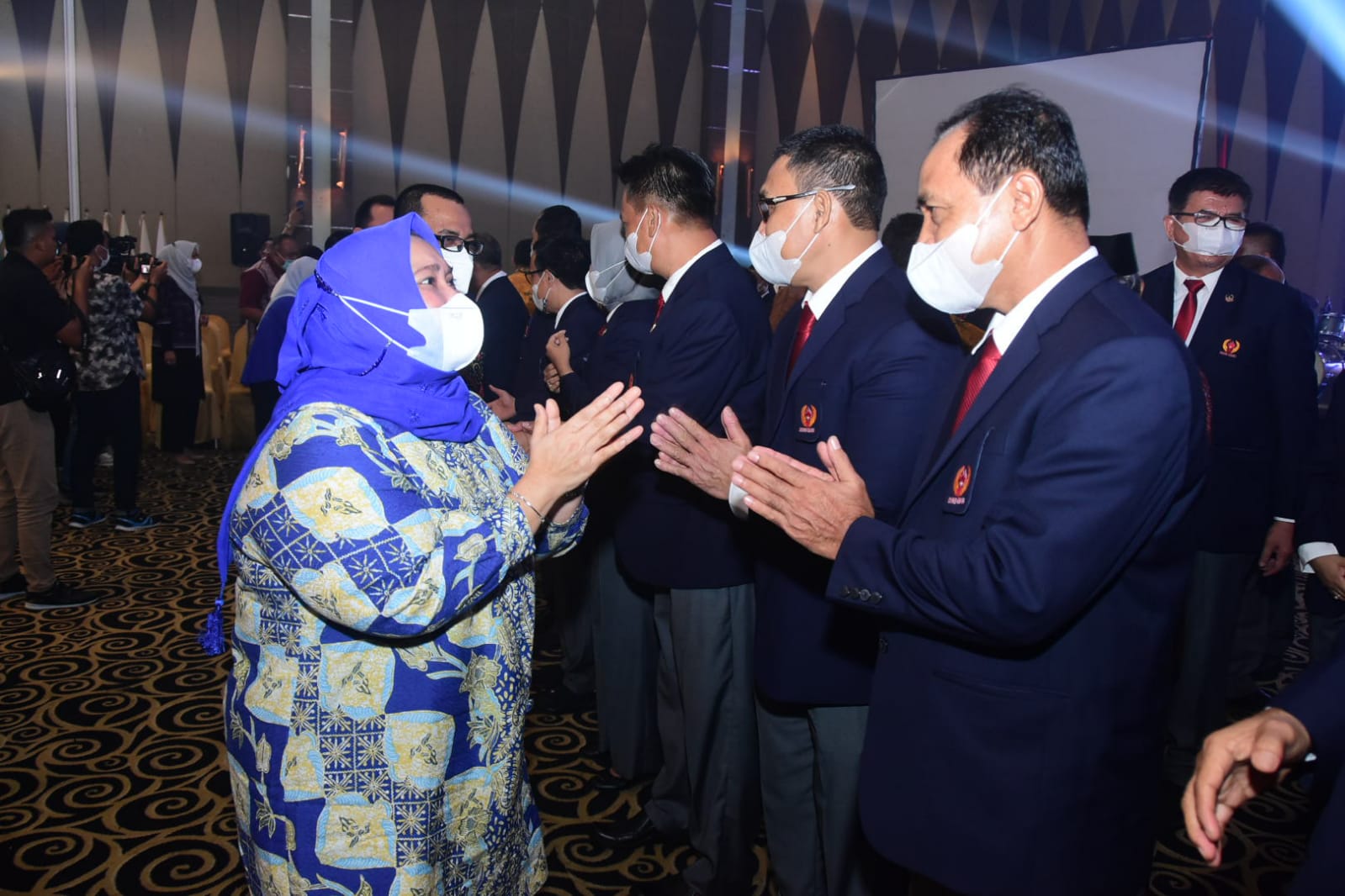 PEKANBARU - Bupati Bengkalis Kasmarni menghadiri pelantikan dan pengukuhan sekaligus memberikan ucapan selamat kepada Ketua dan jajaran pengurus Komite Olahraga Nasional Indonesia (KONI) Provinsi Riau Masa Bakti 2022-2026, Rabu, 8 Juni 2022 di Hotel Pangeran Pekanbaru