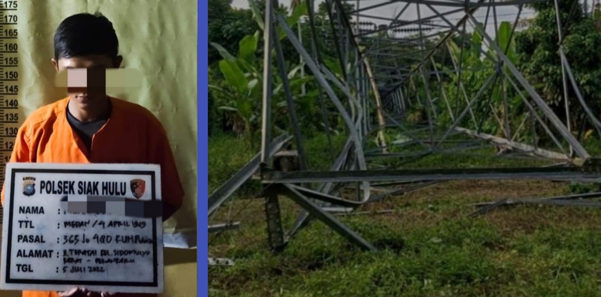 Tower SUTT nomor 69 – 70 Desa Teratak Buluh, Kecamatan Siak Hulu, Kabupaten Kampar. Dengan barang bukti berupa 16 batang besi skor Tower milik PLN Persero.