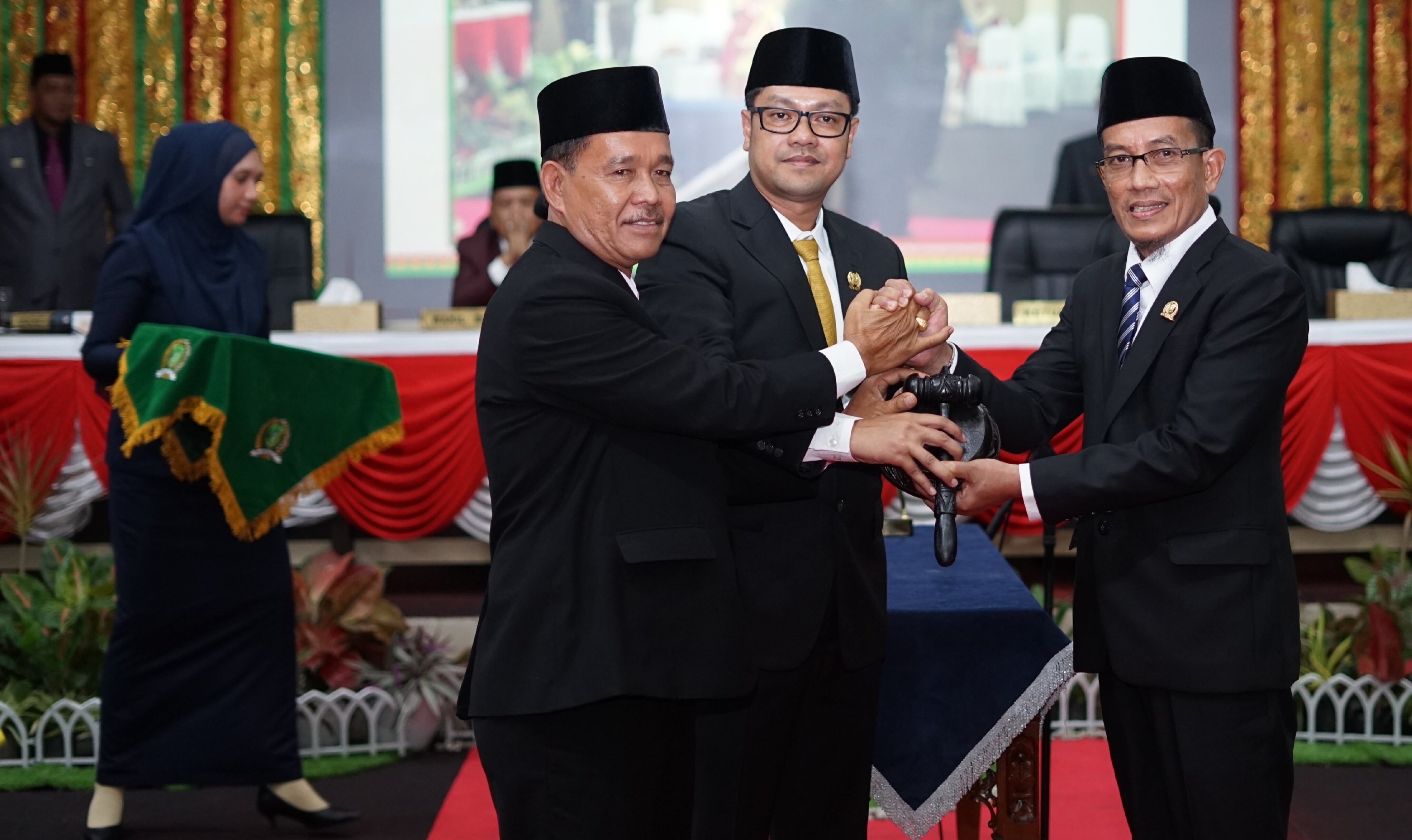 Prosesi pelantikan dilanjutkan dengan penandatanganan berita acara dan juga dilakukan penyerahan secara simbolis palu sidang yang diserahkan oleh Iskandar Budiman kepada Fauzi Hasan.