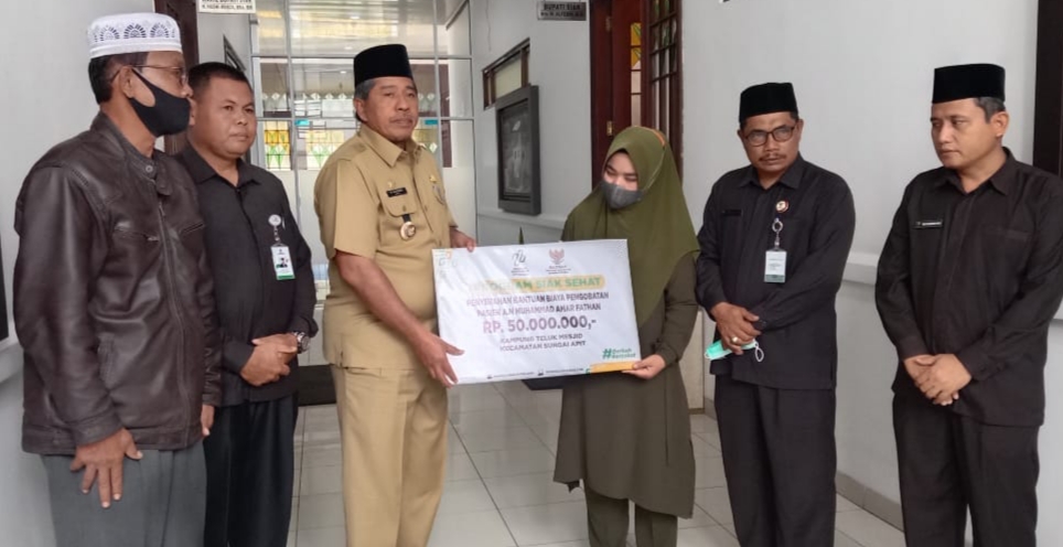 Bupati Siak Alfedri didampingi Komisioner Badan Amil Zakat Nasional (BAZNAS) kabupaten Siak Samparis menyerahkan bantuan biaya perobatan Program Siak Sehat BAZNAS Siak, senilai Rp 50 juta. Bantuan tersebut diberikan kepada ananda Muhammad Ammar Fathan (2) tahun warga Dusun Merambai, Teluk Mesjid kecamatan Sungai Apit, kabupaten Siak penderita gagal hati (Atresiabiler).