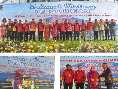 RIAUMADANI. COM, MANDAU - Bupati Bengkalis Kasmarni, menghadiri pengukuhan Pengurus Himpunan Masyarakat Karo Indonesia (HMKI) Dewan Pimpinan Sektor (DPS) Mandau, Pinggir, Bathin Solapan dan Talang Muandau, periode 2023-2025, Sabtu, 3 Juni 2023.