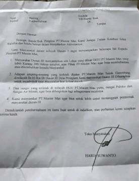 RIAUMADANI. COM, PELALAWAN - Sepucuk surat yang beredar dikalangan awak media, mengundang kontroversi publik. Surat tersebut diduga dibuat oleh salah seorang tokoh masyarakat Desa Pesaguan, Kecamatan Bandar Petalangan, Kabupaten Pelalawan. Dalam surat tersebut tertera tiga poin yang menjadi tuntutan terhadap PT Musim Mas.