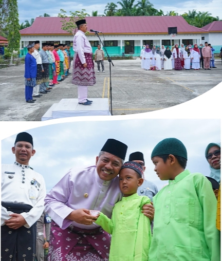 Selesai memimpin Apel pagi Bupati Siak Alfedri membagikan KIA, KTP, serta KK kepada beberapa anak, selain itu juga menyerahkan bibit kepada warga Kampung Tanjung Kuras.