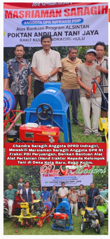 Rakit Kulim, Indragiri, RIAUMADANI.Com- Mewakili Marsiaman Saragih anggota DPR RI Fraksi PDI Perjuangan, Chandra Saragih anggota DPRD Indragiri, berikan bantuan alat alat pertanian sejumlah Hand Traktor kepada Kelompok Tani di Desa Kota Baru, Kecamatan Rakit Kulim, Kabupaten Indragiri, Provinsi Riau.