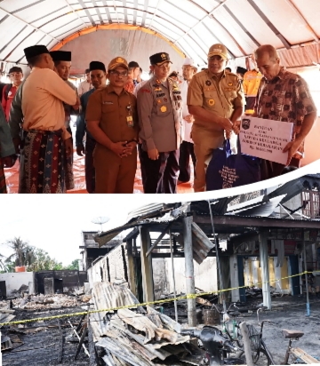 RIAU MADANI. COM. SIAK, Sungai Apit - Bupati Siak Alfedri menyempatkan diri mengunjungi dan menyerahkan bantuan kepada korban kebakaran 15 unit Ruko di Pasar Kelurahan Sungai Apit di depan Ruang Terbuka Hijau (RTH) Syarifah Sembilan di Kecamatan Sungai Apit, kabupaten Siak.