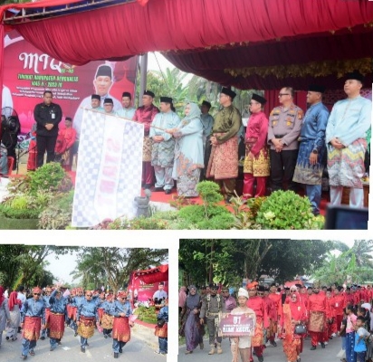 RIAUMADANI. COM, PINGGIR - Bupati Bengkalis Kasmarni didampingi Bupati Bengkalis ke-14 Amril Mukminin secara resmi melepaskan ribuan peserta pawai ta'aruf Musabaqoh Tilawatil Qur'an (MTQ) tingkat Kabupaten Bengkalis, Ahad 3 September 2023, bertempat di panggung penghormatan Kecamatan Pinggir Jalan Muajo Lelo Desa Pinggir.