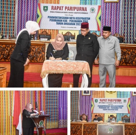 RIAUMADANI. COM, BENGKALIS - Bupati Bengkalis Kasmarni menandatangani Memorandum of Understanding (MoU) Perubahan Kebijakan Umum Anggaran dan Prioritas Plafon Anggaran Sementara (KUA-PPAS), bersama Pimpinan DPRD Bengkalis, Sofyan dan Syaiful Ardi dalam Rapat Paripurna, di Gedung DPRD, Selasa malam, 19 September 2023.