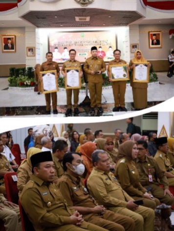 RIAUMADANI. COM, SIAK - Bupati Siak melalui wakil bupati Siak Husni Merza menerima piagam penghargaan Universal Health Coverage (UHC) dari BPJS Kesehatan, yang di serahkan secara langsung Gubernur Riau Syamsuar, bertempat di Gedung Daerah Pauh Janggi Pekanbaru Provinsi Riau, Senin (16/10/2023).