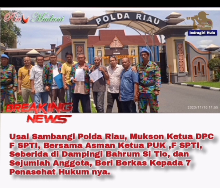 BAHRUM TIO TEGASKAN, PADA SAAT PEMUTUSAN AKSES JALAN PT. NHR, IA BELUM BERADA DI LOKASI UNRAS. *Usai Sambangi Polda Riau, Mukson Ketua DPC F SPTI, Bersama Asman Ketua PUK ,F SPTI, Seberida di Dampingi Bahrum Si Tio, dan Sejumlah Anggota, Beri Berkas Kepada 7 Penasehat Hukum nya*.