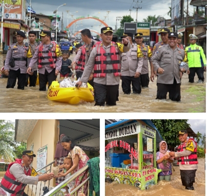 RIAUMADANI. COM. ROKAN HULU - Luar biasa, sikapnya dinilai responsif, Kapolres Rokan Hulu (Rohul) AKBP Budi Setiyono SIK MH, langsung terjun ke masyarakat terkena banjir, akibat luapan Air Sungai Batang Lubuh di wilayah Kecamatan Rambah, Selasa (26/12/2023) sekira pukul 16.30 Wib.