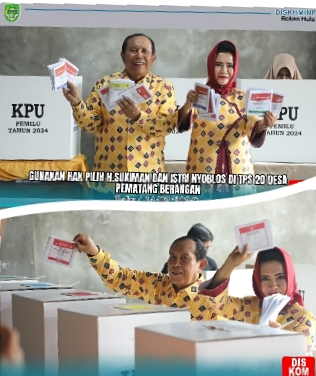 Bupati Sukiman tiba di TPS pukul 09:00 Wib dan sampai di TPS Bupati dan Istri juga menyapa dan menyalami satu persatu masyarakat yang telah berada di TPS H.Sukiman dan istri juga ikut antri bersama masyarakat sambil menunggu panggilan masuk ke bilik suara.