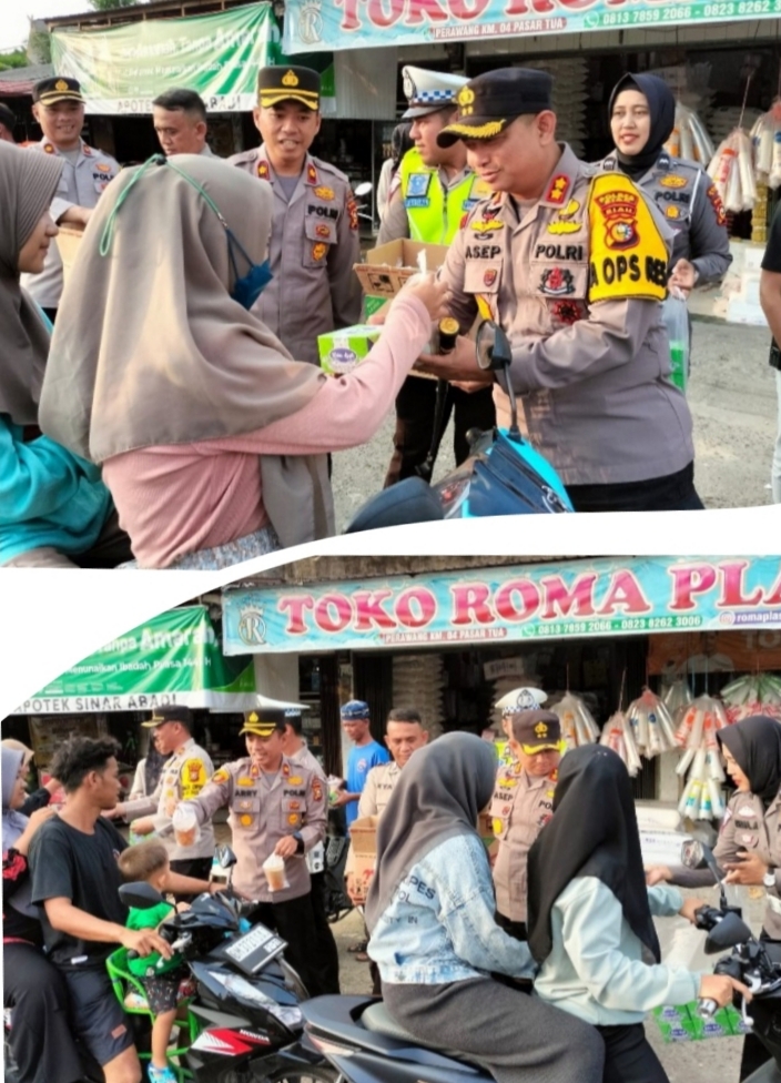 RIAUMADANI. COM. SIAK, Perawang - Bertepatan hari ke-5 Bulan Ramadhan 1445H/2024M, Kapolres Siak Akbp Asep Sujarwadi S.I.K,M.S.I didampingi Waka Polres Siak Kompol Ade Zalni. S.Farm, Apt, S.I.K dan beberapa pejabat Utama Polres Siak bersama Kapolsek Tualang Kompol Arry Prasetyo. SH.MH membagikan Takjil Gratis di Jl. Raya Km. 4 Pasar Tuah Serumpun depan Pos Pam Kec. Tualang, Sabtu (16/3/2024) sore.