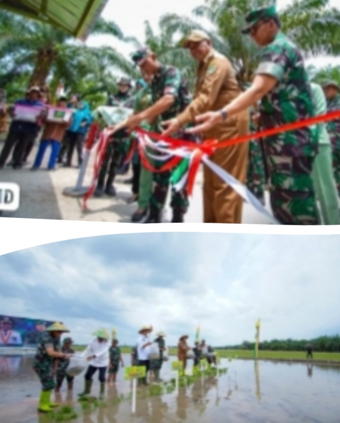 RIAUMADANI. COM. SIAK, Sabak Auh - Inspektur Jenderal TNI Angkatan Darat (Irjenad) Letjen Erwin Djatmiko didampingi Pangdam I/Bukit Barisan Mayjen Mochammad Hasan Hasibuan, Danrem 031/WB Dany Racka Anadalasawan dan Bupati Siak Alfedri menanam padi dan penaburan benih ikan, di area persawahan Kampung Sungai Tengah, Kecamatan Sabak Auh, Kabupaten Siak.