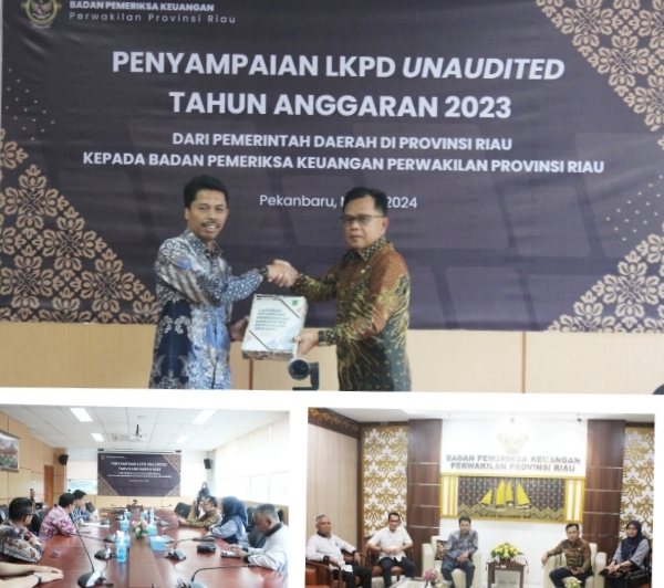 RIAUMADANI. COM, PEKANBARU - Pemerintah Kabupaten (Pemkab) Kepulauan Meranti menyerahkan Laporan Keuangan Pemerintah Daerah (LKPD) Unaudited tahun 2023 kepada Badan Pemeriksa Keuangan (BPK) RI Perwakilan Provinsi Riau, Kamis (28/3/2024) di Pekanbaru.