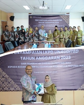 RIAUMADANI. COM, PEKANBARU - Bupati Bengkalis Kasmarni menyerahkan Laporan Keuangan Pemerintah Daerah (LKPD) Unaudited (laporan yang belum diaudit) tahun 2023 kepada Badan Pemeriksa Keuangan (BPK) RI Perwakilan Provinsi Riau Selasa, 26 Maret 2024 di Kantor BPK Perwakilan Provinsi Riau, Jalan Sudirman Pekanbaru.