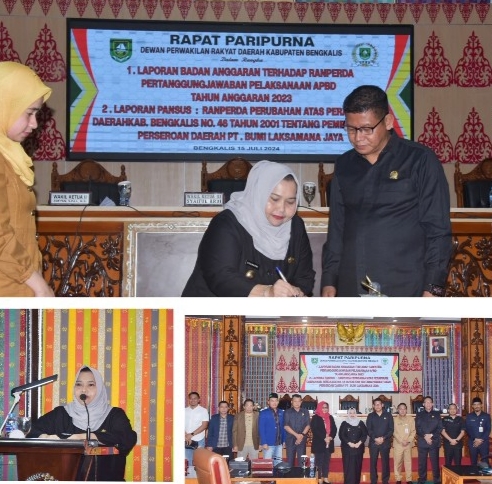 Rapat paripurna dua Ranperda, diakhiri dengan penandatanganan berita acara persetujuan bersama oleh Bupati Bengkalis Kasmarni dan Pimpinan DPRD Kabupaten Bengkalis Sofyan.