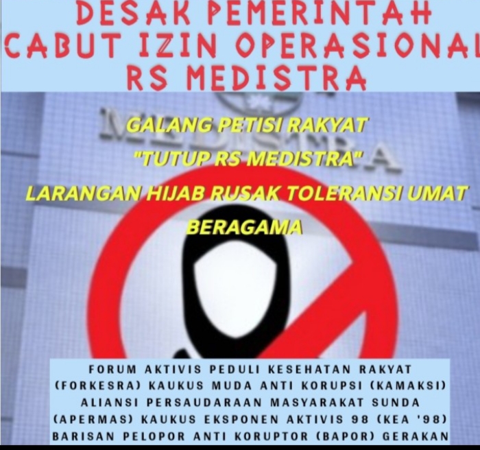 Dua pelamar yang mengenakan hijab ditanya oleh pihak RS Medistra apakah mereka bersedia melepas hijab jika diterima bekerja. Pertanyaan ini menuai kritik keras dari berbagai pihak, termasuk R. Agung Gunawan, Sekjen KAUKUS EKSPONEN AKTIVIS 98 (KEA '98) dan Ketua Umum ALIANSI PERSAUDARAAN MASYARAKAT SUNDA (APERMAS).