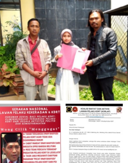 "Kami dari Pimpinan Organisasi Aktivis datang ke Kantor KOMNAS PEREMPUAN meminta Pimpinan/Komisioner agar ikut andil menyoroti kasus KDRT yang terjadi di Bangka Belitung yang menjerat Imam Wahyudi (IW) seorang Oknum Legislator di DPRD Bangka Belitung. Dalam penanganan kasus KDRT tersebut kami menduga terjadinya praktek diskriminasi hukum dengan tidak ditahannya tersangka IW. Kami juga menduga adanya upaya intimidasi terhadap korban seperti yang sudah dilansir beberapa media nasional. Perjuangan kami menegakkan keadilan agar tidak ada diskriminasi hukum tidak akan berhenti, kami akan terus bergerak melawan segala bentuk kekerasan terutama KDRT siapapun Pelaku KDRT termasuk Anggota DPRD sekalipun harus berani mempertanggung jawabkan perbuatannya yang telah merendahkan harkat perempuan dengan melakukan tindak kekerasan. Tersangka Pelaku KDRT Imam Wahyudi harus segera ditangkap dan dipecat dari Anggota DPRD Bangka Belitung tidak pantas seorang tersangka Pelaku KDRT menjabat sebagai Wakil Rakyat di Legislatif," tegas Sutisna Koordinator Aktivis KORLAP (KOALISI RAKYAT DAN AKTIVIS LAWAN PELAKU KDRT).