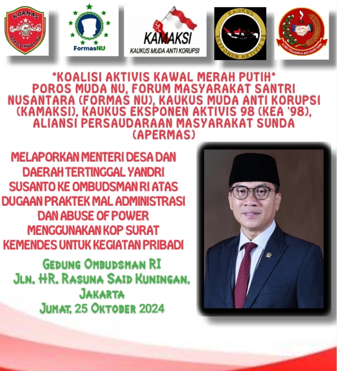 RIAUMADANI. COM, JAKARTA - Koalisi Aktivis Kawal Merah Putih yang terdiri dari 5 Organisasi Aktivis Nasional antara lain POROS MUDA NU, FORUM MASYARAKAT SANTRI NUSANTARA (FORMAS NU), KAUKUS MUDA ANTI KORUPSI (KAMAKSI), ALIANSI PERSAUDARAAN MASYARAKAT SUNDA (APERMAS) dan KAUKUS EKSPONEN AKTIVIS 98 (KEA '98) akan melaporkan Menteri Desa dan Pembangunan Daerah Tertinggal Yandri Susanto ke Ombudsman RI pada hari Jumat 25 Oktober 2024.