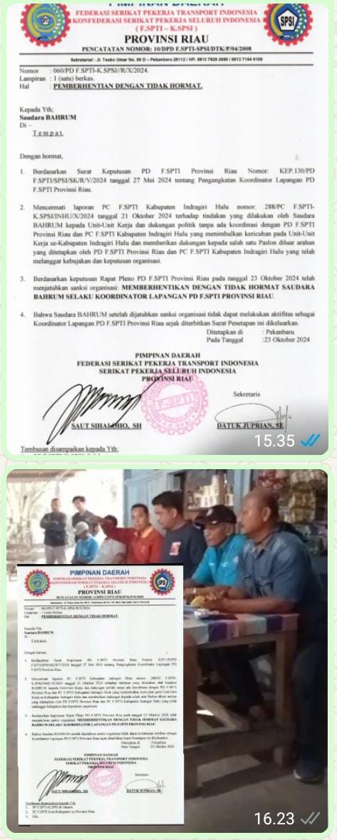Mencermati laporan PC F. SPTI Kabupaten Indragiri Hulu (Inhu) Nomor : 288 PC F. SPTI- K. SPSI/INHU/X/2024, tanggal 31 Oktober 2024 terhadap tindakan yang di lakukan oleh Sdr. Bahrum kepada unit-unit kerja dan dukungan politik tanpa ada koordinasi dengan PD F. SPTI Provinsi Riau dan PC F. SPTI Kab. Inhu yang menimbulkan kericuhan kericuhan pada unit unit kerja se Kab. Inhu, dan memberikan dukungan kepada salah satu Paslon di luar arahan yang di tetapkan oleh PD. F. SPTI Provinsi Riau dan PC. F. SPTI Kab. Inhu yang telah melanggar kebijakan dan keputusan organisasi.