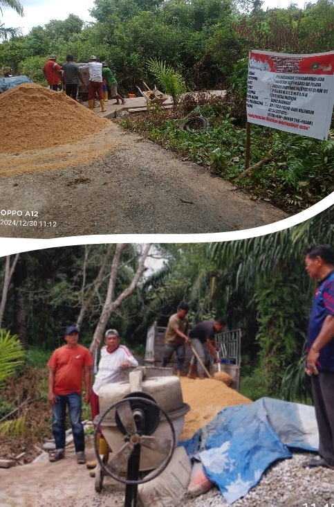Salah satunya di Desa Meskom kecamatan Bengkalis saat ini lagi pelaksanaan pekerjaan jalan Pusara Dusun Simpang Merpati dengan panjang 65 meter lebar 2,2 meter jalan ini menuju keperkubuaran umum desa