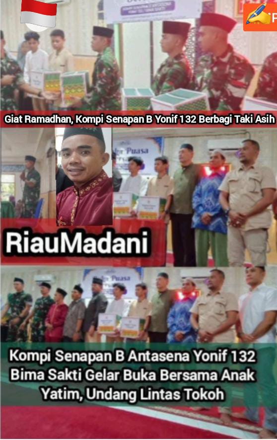Japura, Inhu, RIAUMADANI. Com- Untuk mempererat tali silaturahmi dan memperkuat ukhuwah islamiyah, Kompi Senapan B Antasena Yonif 132 Bima Sakti menggelar buka bersama dan memberikan santunan kepada sejumlah anak yatim piatu, sebagai bentuk kepedulian TNI terhadap sesama umat.