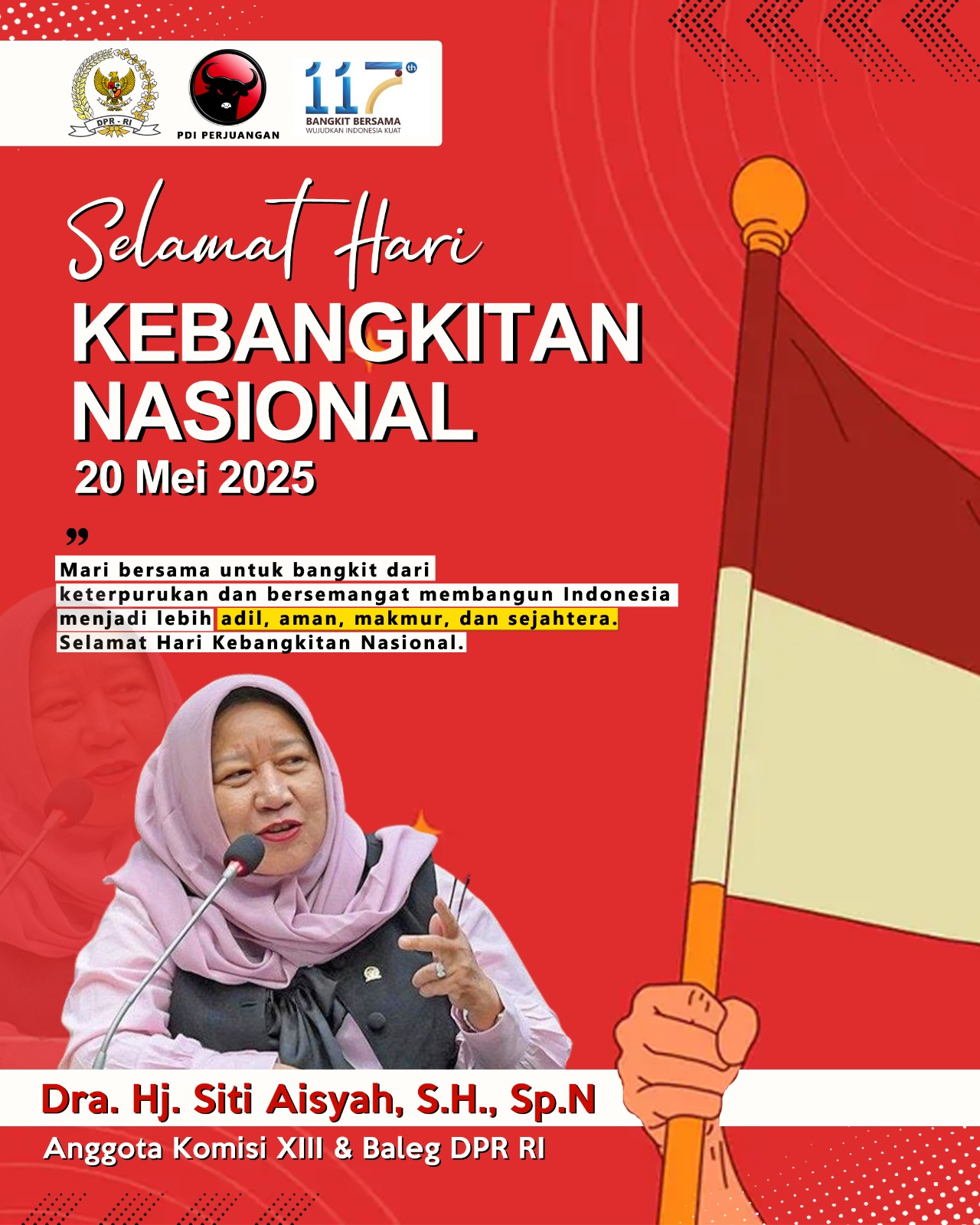 Dalam Rangka Memperingati Hari Kebangkitan Nasional, Saya,, Dra. Hj. Siti Aisyah, SH, S.pN Anggota Komisi XIII & Baleg DPR RI, Fraksi PDI Perjuangan Mengucapkan :