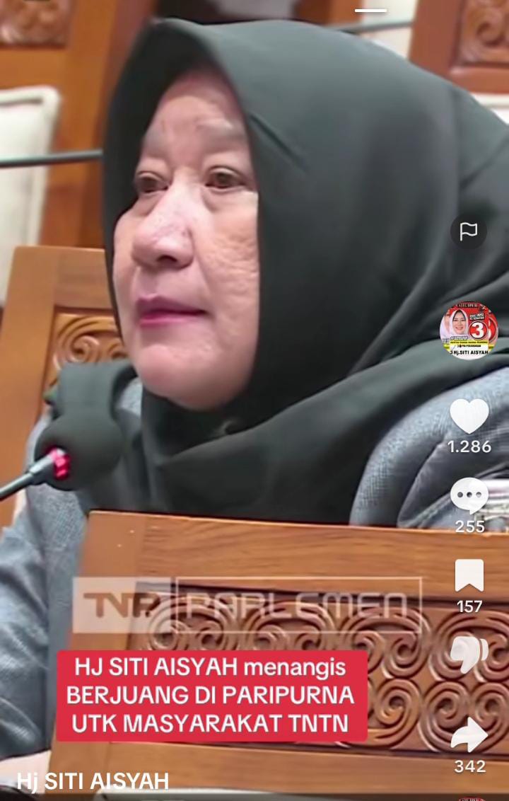 Dalam kesempatan interupsi yang diberikan pimpinan rapat, dengan suara gemetar menahan rasa haru nya Hj. Siti Aisyah Anggota DPR RI, Komisi XIII, Fraksi PDI Perjuangan, Dapil Riau II memaparkan, bahwa sampai hari ini masyarakat yang berada di TNTN sedang memperjuangkan haknya.
