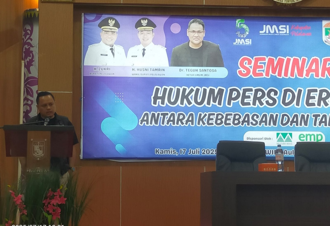 Seminar diselenggarakan oleh pengurus JMSI (Jaringan Media Siber Indonesia) Kabupaten Pelalawan di aula kantor Bappeda (Badan Perencanaan Pembangunan Daerah) Kabupaten Pelalawan Kamis (17/7/2025). Dalam seminar itu JMSI Pelalawan menghadirkan narasumber seorang dosen Fak. Hukum UIR Praktisi Pers Riau Assoc. Prof. Syafriadi, SH., MH. Hadir Bupati Pelalawan yang diwakili oleh Asisten 1 H. Zulkifli S.Ag, kepala Dinas Kominfo Kabupaten Pelalawan, Faisal S.STP, ketua JMSI Propinsi Riau, H Deni Kurnia dan sejumlah ketua organisasi pers di Kabupaten Pelalawan dan para wartawan sebagai peserta.