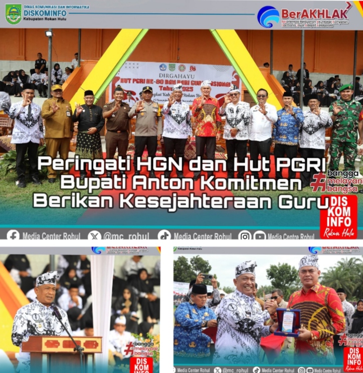 "Selamat Hari Guru dan HUT PGRI yang ke 80,  Semoga Allah menguatkan langkah kita semua dan semoga daerah ini tidak pernah lupa siapa yang mengajarkan mereka membaca, menulis, dan bermimpi," pungkas Bupati Anton mengakhiri (Kominfo Rohul/SandySPR).