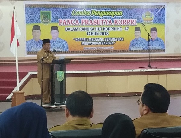 Wakil Bupati Rokan Hilir Drs H Jamiludin dalam sambutannya mengatakan lomba pembacaan Panca Prasetya Korpri tanpa teks merupakan bagian rangkaian kegiatan dalam rangka memperingati Hari Ulang Tahun (HUT) Korp Pegawai Republik Indonesia yang ke - 47 tahun sekaligus bersempena dengan Hari Guru Nasional (HGN) ke - 73 tahun 2018.