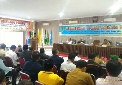 Muscab Koni itu mengangkat tema "Melalui Musyawarah Olah Raga Kabupaten Musorkab I Koni Rohil 2018, Satukan Tekat Meningkatkan Prestasi Menuju Porprop Riau X tahun 2021".