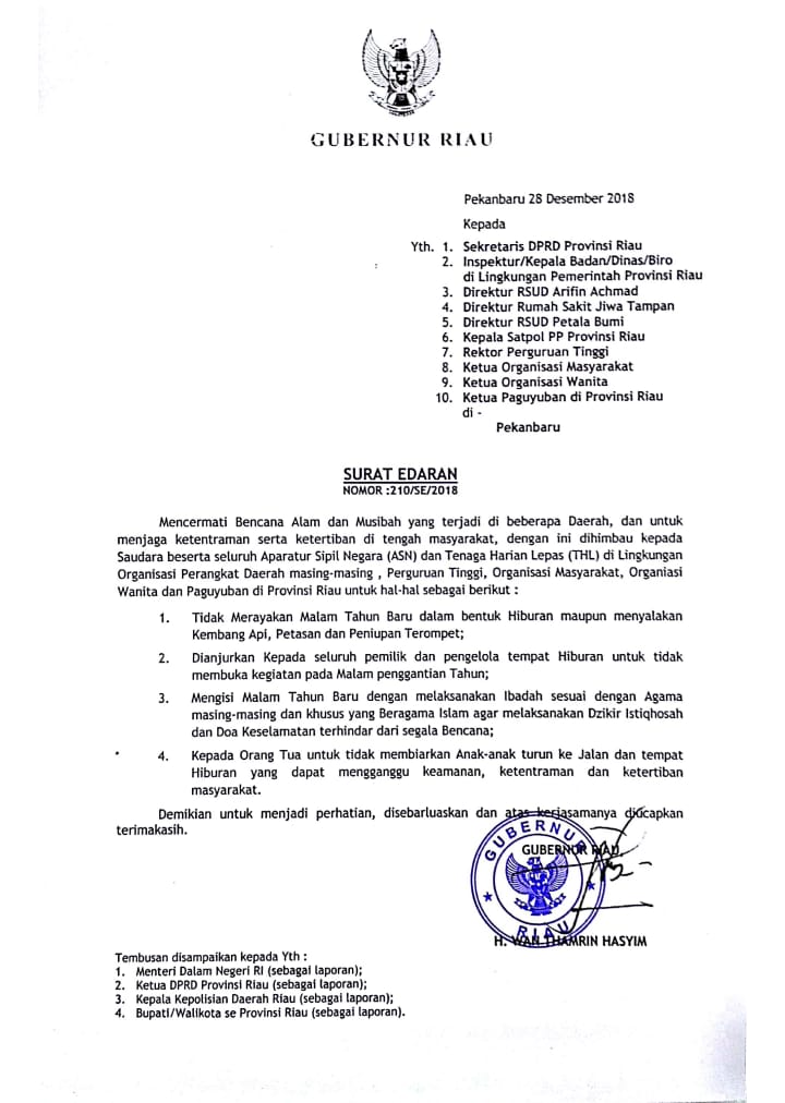 PEKANBARU. RIAUMADANI. com - Gubernur Riau, Wan Thamrin Hasyim telah mengeluarkan surat edaran menyikapi malam tahun baru 2019.