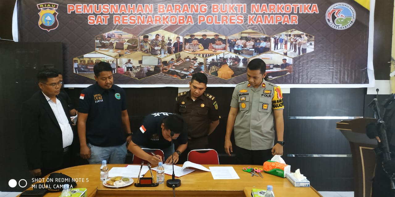 BANGKINANG. RIAUMADANI. com - Satuan Reserse Narkoba Polres Kampar menggelar pemusnahan barang bukti narkotika, pada Kamis pagi (24/1/2019) sekira pukul 10.15 Wib bertempat diruang data Polres Kampar.