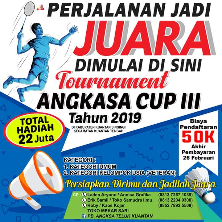 Teluk Kuantan. RIAUMADANI. com - Informasi gembira tertuju untuk para pecinta Bulu Tangkis Kuansing, Persatuan Badminton (PB) Angkasa akan mengelar Tournamen Angkasa Cup yang ke III.