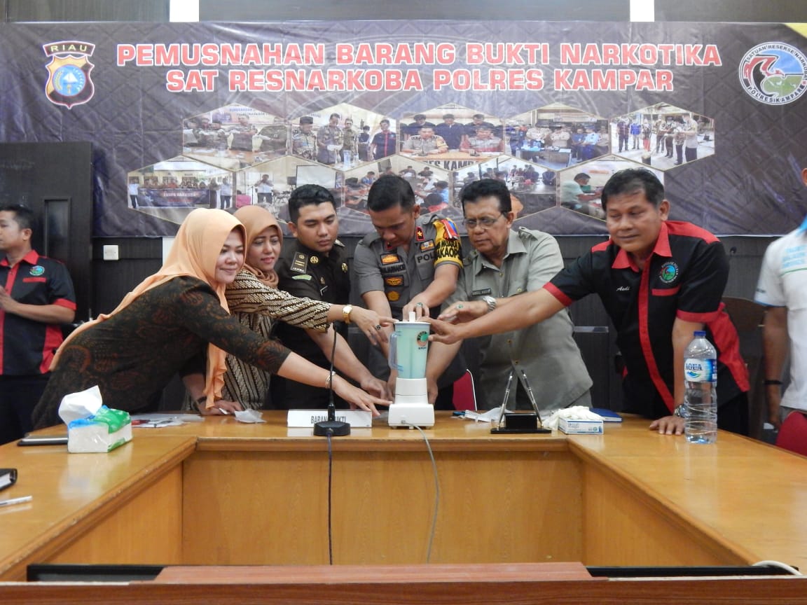 Pemusnahan barang bukti narkotika ini dipimpin oleh Waka Polres Kampar Kompol B.E. Banjarnahor SIK MH yang mewakili Kapolres Kampar, dan dihadiri Kasat Narkoba Iptu Asdisyah Mursid SH, Kalakhar BNK Kampar AKBP (Purn) Abdul Kadir beserta Staf BNK Mhd. Shalis MH.
