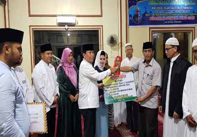 Bupati Sukiman didampingi Sekda Abdul Haris, serahkan bantuan untuk anak yatim dari BAZNas Rohul ke pengurus masjid, Masjid Al- Islah saat Safari Ramadan di Kecamatan Tambusai.