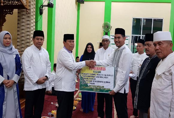 Safari di Kecamatan Rambah Samo, Bupati Rohul juga menyerahkan santunan dari Pemkab Rohul, ‎untuk ana‎k Yatim sebesar Rp10 juta. Serta menyalurkan bantuan dari Baznas dengan total Rp 115 juta. (ADV/Pemkab Rokan Hulu)
