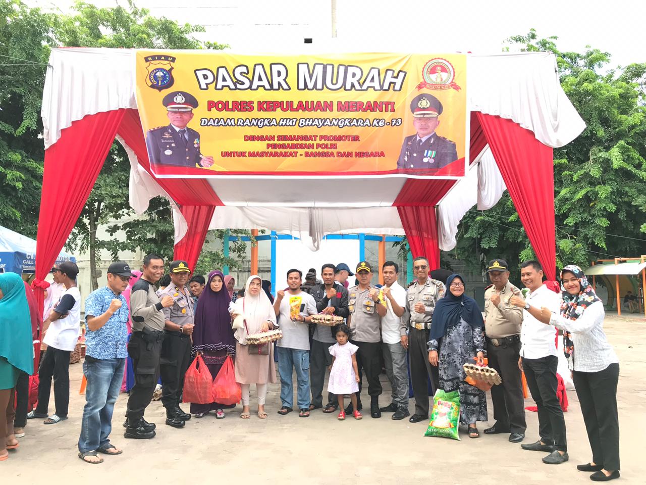 Bersempena HUT Bhayangkara ke 73 tahun 2019 Polres Kepulauan Meranti membuka pasar murah yang berlokasi di taman Cik Puan Selatpanjang kota, Minggu (23/06/2019).