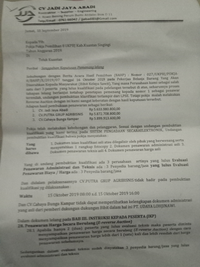 Padahal perusahaan kami sebagai satu dari 3 peserta yang lulus kualifikasi pada pelelangan tersebut bahkan mengajukan nilai harga terendah tetapi kenyataannya kami dikalahkan oleh pengaju nilai kontrak terbesar. Undangan pembuktian klarifikasi terlampir dari LPSE,panitia malah melakukan Reverse Auction makanya kami sangat keberatan dengan kebijakan panitia.Berikut hasil Pembukaan penawaran sbb,CV Jadi Jaya Abadi Rp 5.633.980,CV Putra Gruf Agribisnis Rp 5.872.708.000,00 dan CV Cahaya Bunga Kqmpar senilai Rp 5.899.913,00